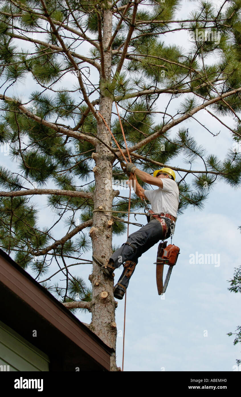 Tree Climber Trimming Branches On Pine Tree Stock Photo Alamy